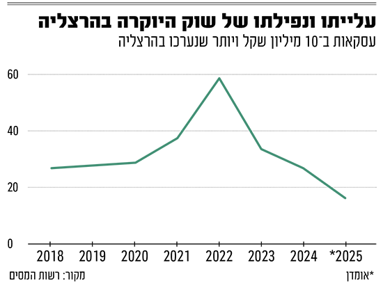 עניין זה, של אי־התאמה בין שוק היוקרה הלאומי לזה של הרצליה, בא לידי ביטוי גם בשנה שעברה, כשברמה הארצית חלה עלייה של כמעט 50% במספר עסקאות היוקרה לעומת 2023, אך בהרצליה המספר דווקא צנח בכמעט רבע ל־26 עסקאות.
