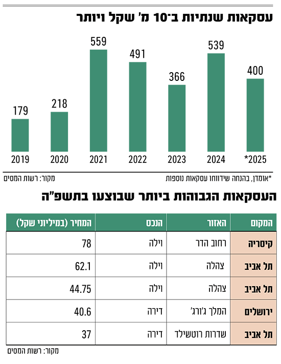 במחצית הראשונה של השנה נרשמו כ־150 עסקאות במחירים של 10 מיליון שקל ויותר, באתר רשות המסים. מהנסיון שלנו ניתן לקבוע, כי אין מדובר במספר סופי, וכי בחודשים הקרובים הוא יעודכן בעסקאות נוספות שנרשמו ברשות המסים, אך מסיבות לא ברורות טרם נכללו באתר.