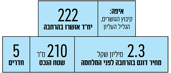 העסקה: צמוד קרקע עם 5 חדרים, בשטח 210 מ"ר, בהרחבה של קיבוץ הגושרים, נמכר תמורת 5.05 מיליון שקל. העסקה בוצעה באמצעות המתווכת תאיר ברבי־ליזרוביץ מא.א.א. יזמות נדל"ן.