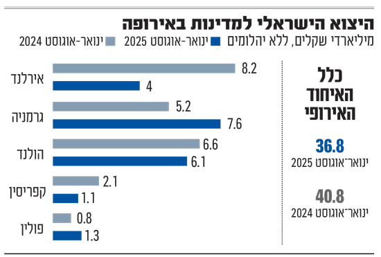 היצוא לאירלנד מתחילת השנה נחתך מ-8.2 מיליארד שקל בין ינואר לאוגוסט 2024 ל-3.9 מיליארד שקל בלבד בתקופה המקבילה ב-2025. אומנם צניחה דרמטית זו מפוצה מעט כאמור על ידי עלייה של 2.3 מיליארד שקל ביצוא לגרמניה באותה תקופה, אך סך היצוא לאיחוד האירופי נחלש ב-4 מיליארד שקל. זאת גם עקב ירידה של מיליארד שקל ביצוא לקפריסין באותה תקופה, בעיקר של כימיקלים.