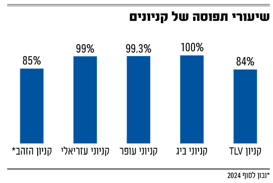 בדיווח לבורסה, מציינת מליסרון כי שיעור התפוסה של הקניון נכון לסוף שנת 2024 עמד על כ-85%, כאשר מספר השוכרים בקניון עמד באותה תקופה על כ-400. מדובר באחוזי תפוסה נמוכים יחסית לאחד הקניונים הגדולים והמוכרים בישראל: לשם השוואה, במחצית הראשונה של 2025 שיעור התפוסה של קניוני עזריאלי עמד על 99%, שיעור התפוסה של קניוני עופר, שגם הם בבעלות חברת מליסרון, עמד באותה תקופה על 99.3%, בקניוני ביג שיעור התפוסה עמד על 100% בקירוב במחצית הראשונה של השנה, ושיעור התפוסה של קניון TLV, בשליטת חברת רבוע כחול נדל"ן, עמד על 84%.